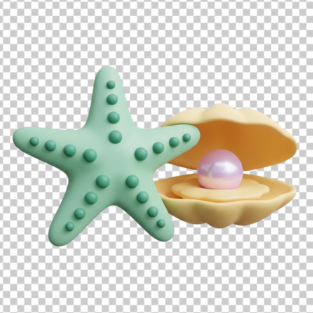 3D Illustration of a Green Starfish and Pearl in Open Shell PNG Transparent Background