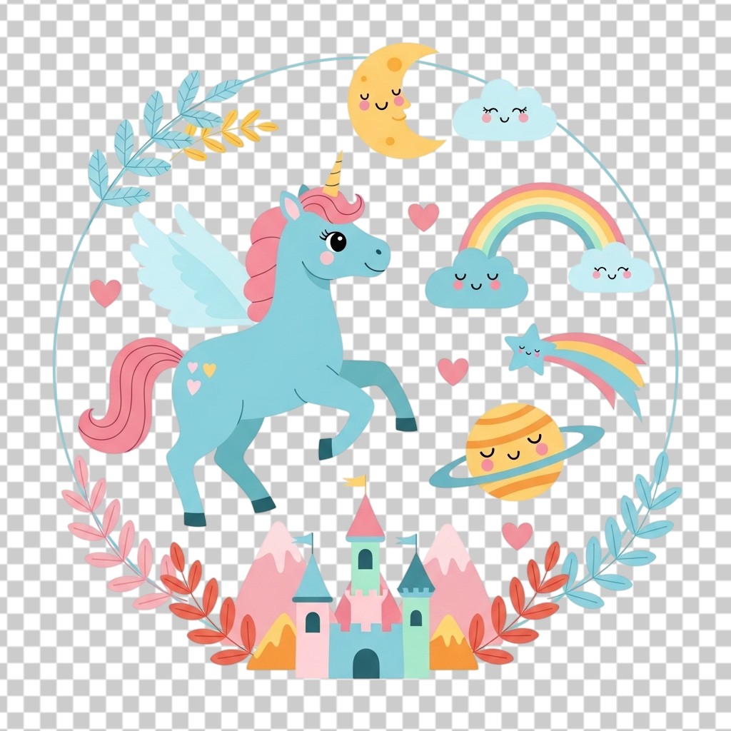 Magical Unicorn with Castle Rainbow and Moon Illustration PNG Transparent Background
