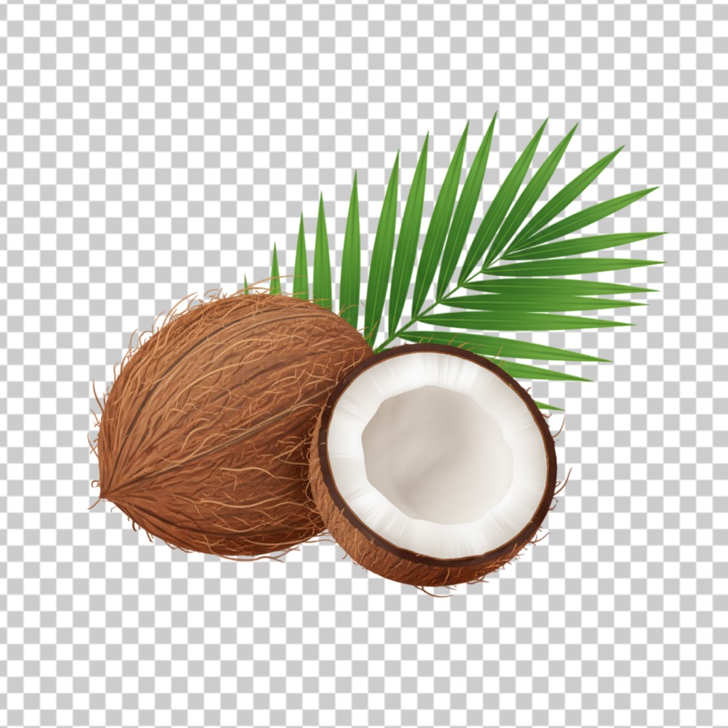 Brown Coconut with Half and Green Palm Leaf PNG Transparent Background