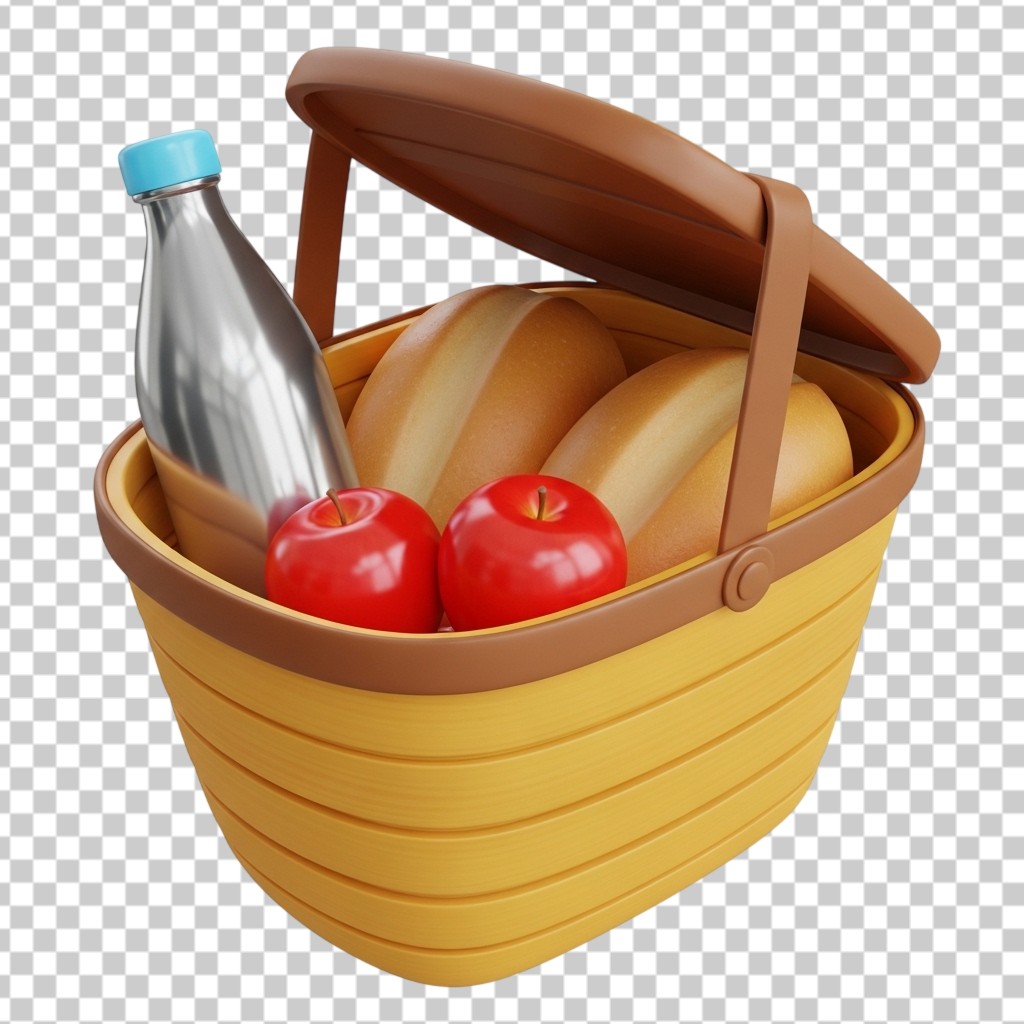 3D Wooden Picnic Basket with Apples and Beverage PNG Transparent Background