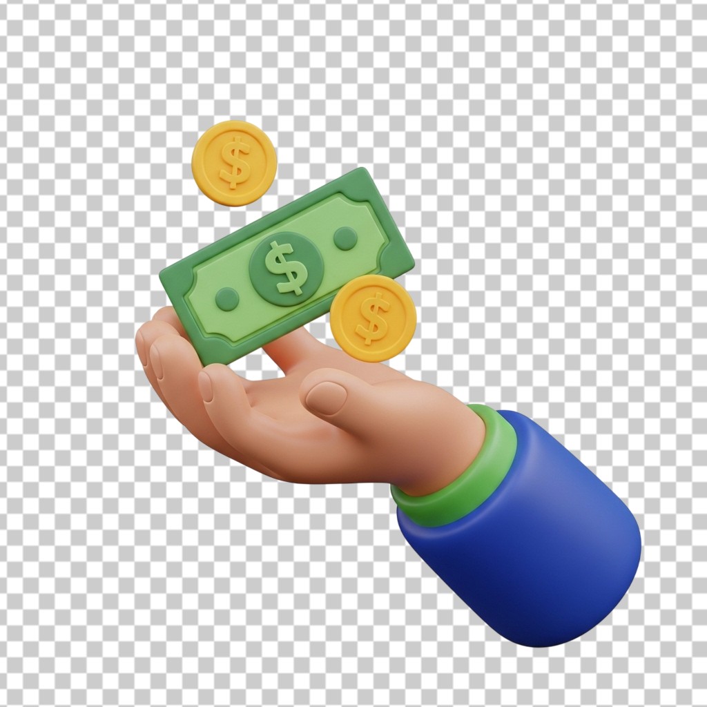 3D Hand Holding Cash Money and Coins PNG Transparent Background