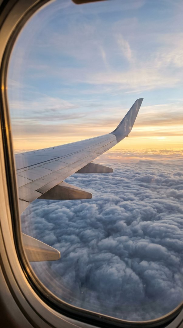 A breathtaking aerial view from an airplane window showing the wing soaring above a sea of clouds illuminated by the golden hour. Captured during a peaceful transcontinental flight.