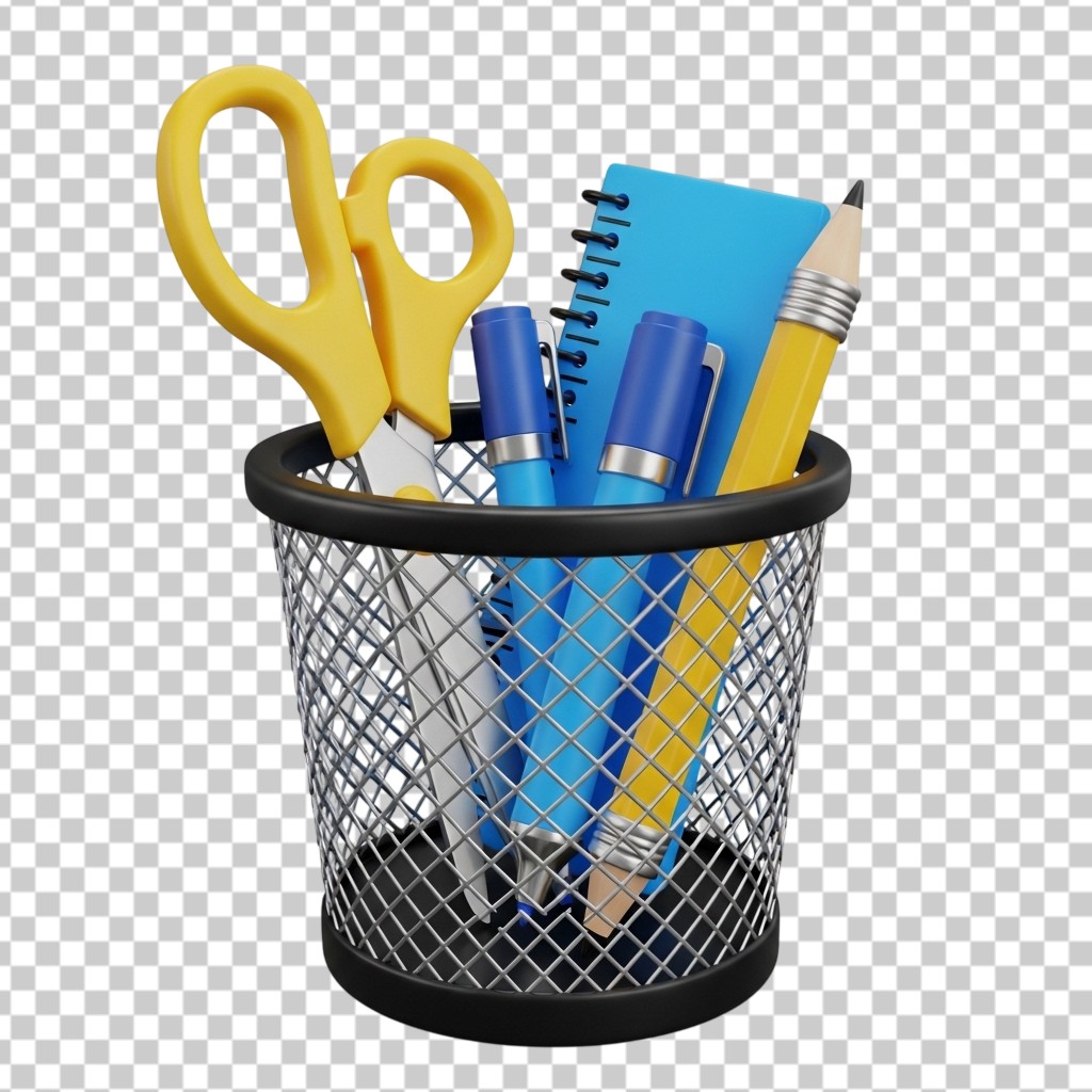 3D Desktop Pencil Holder with Stationery Pens and Scissors PNG Transparent Background