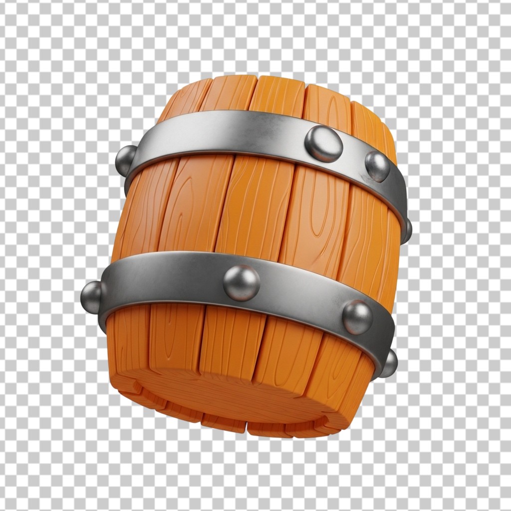 3D Wooden Barrel with Metal Bands Traditional Storage Container PNG Transparent Background