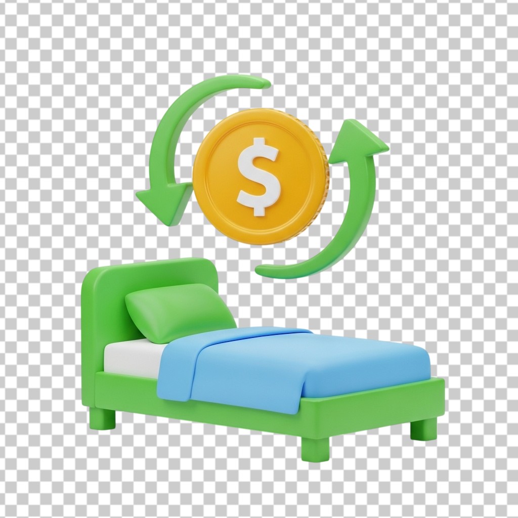 3D Hotel Bed with Currency Exchange Concept Illustration PNG Transparent Background