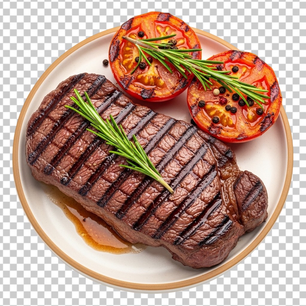 Perfectly Grilled Beef Steak served with Charred Tomatoes and Herb Garnish PNG Transparent Background