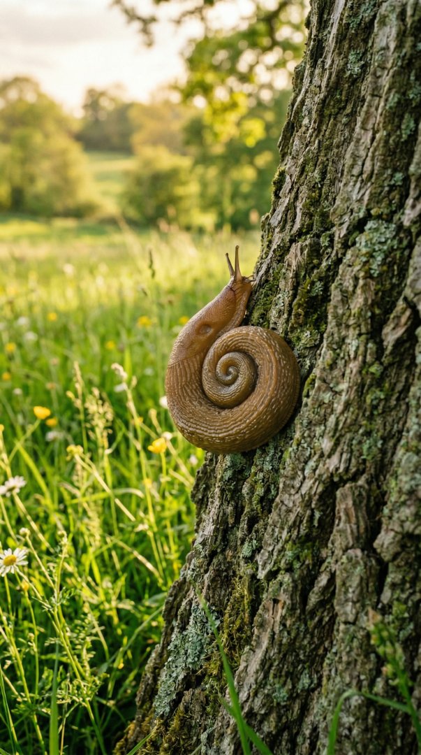 A macro nature photo showing a resting snail stuck to the side of a tree in a sunlit meadow.
