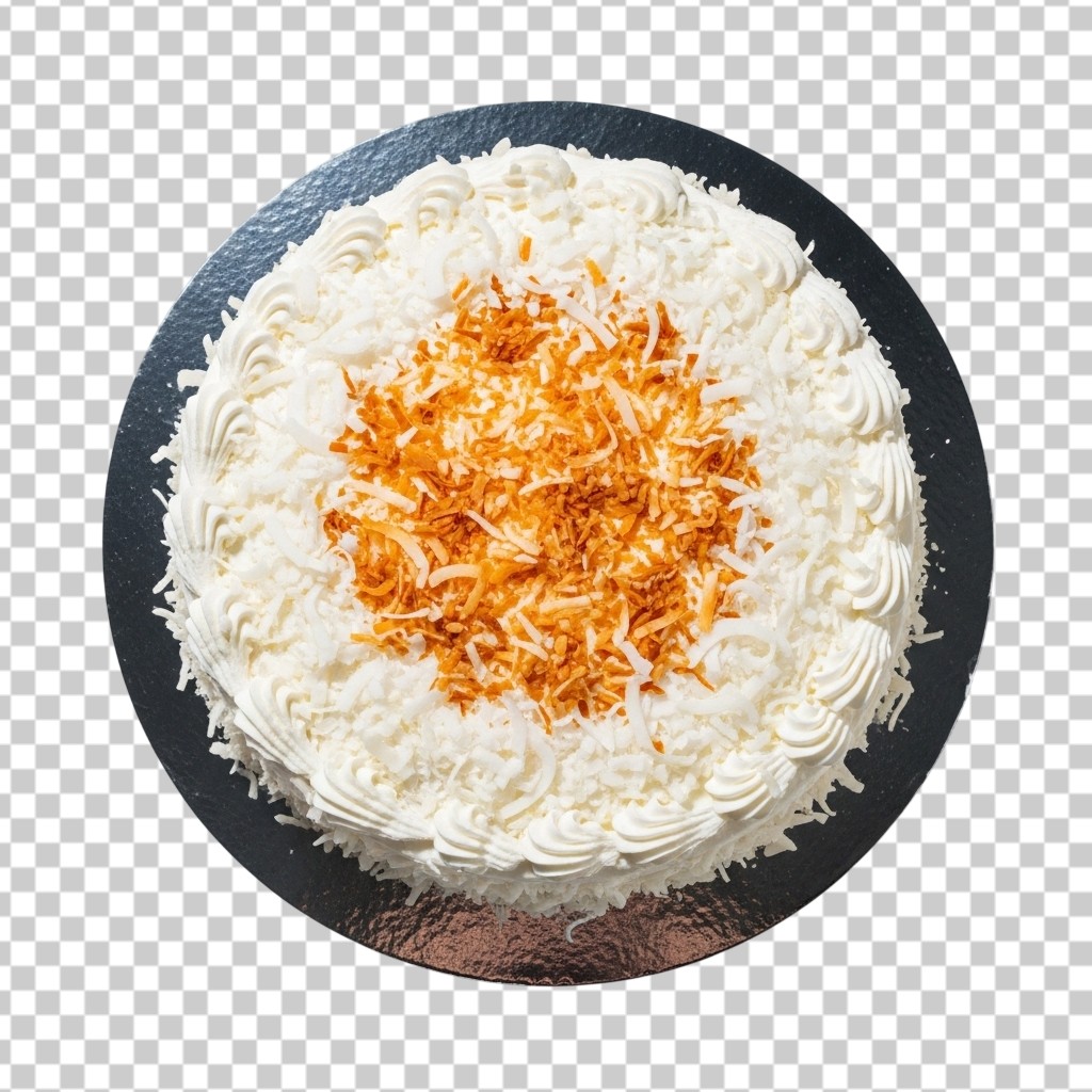 Top View of a Whole Delicious Coconut Cream Cake with Rich Flaked Coconut PNG Transparent Background