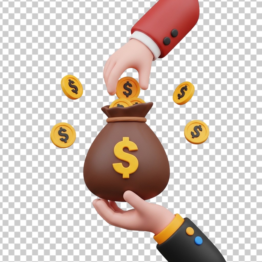 3D Hands Transferring Brown Money Bag with Dollar Sign PNG Transparent Background