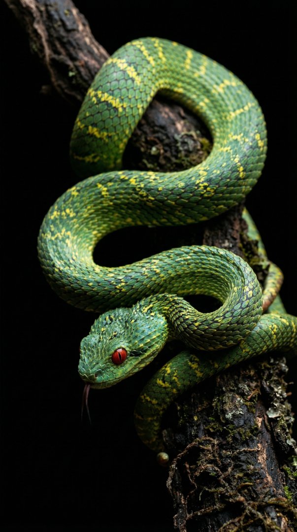 An intense close-up of a dangerous green snake coiled on a branch with its tongue out in the dark.