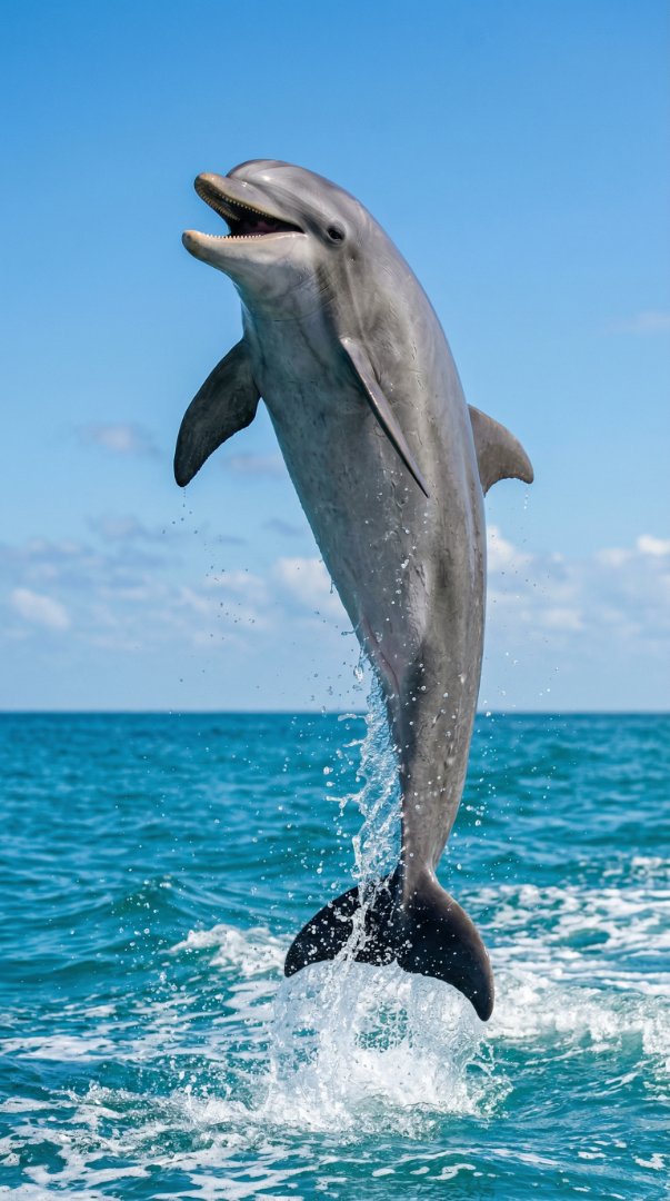 A spectacular action shot of a playful dolphin leaping vertically from the blue sea water into the air.