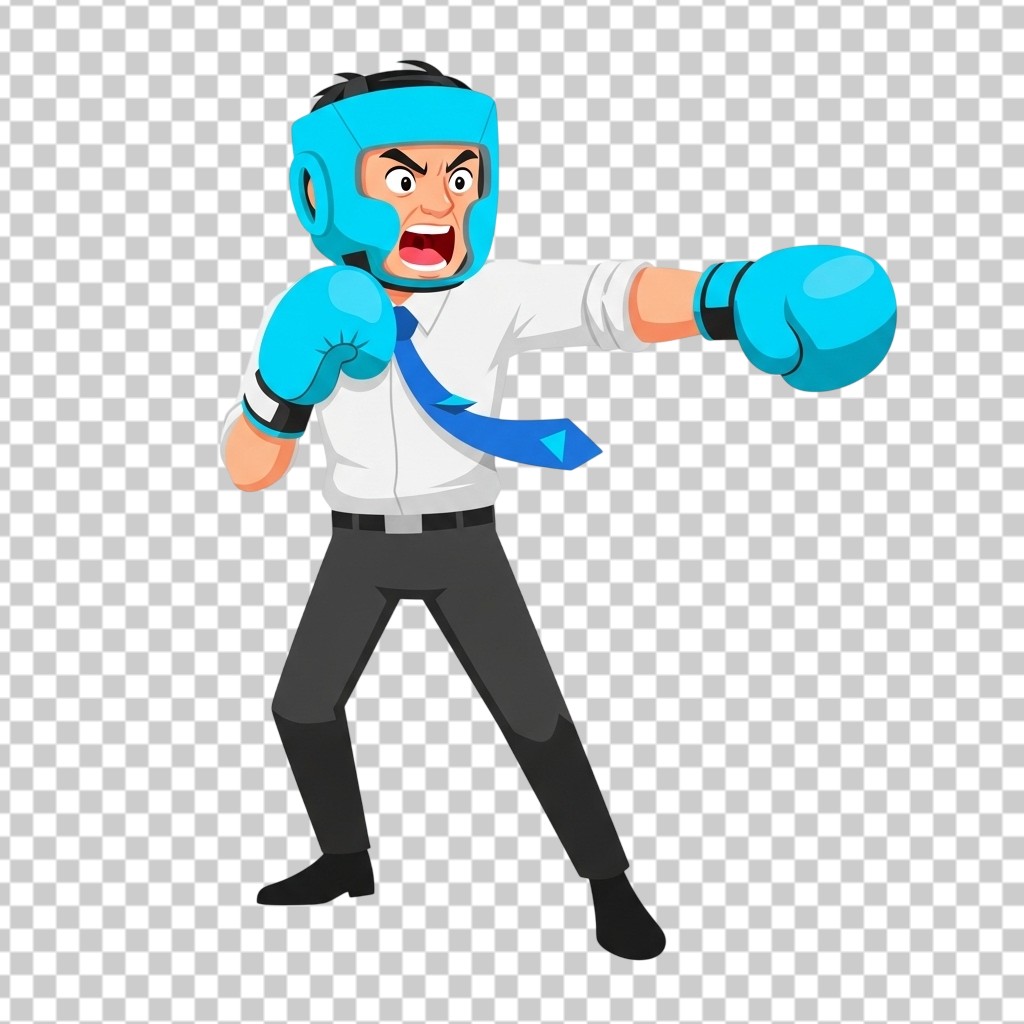 Funny Cartoon Businessman Wearing Boxing Gloves and Helmet PNG Transparent Background