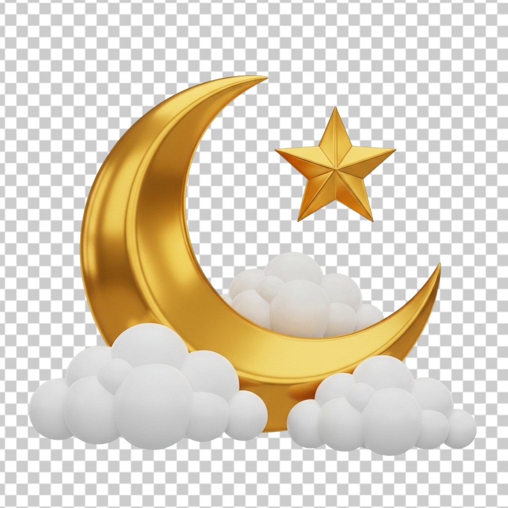 Islamic Golden Crescent Moon and Star with White Clouds 3D Illustration PNG Transparent Background