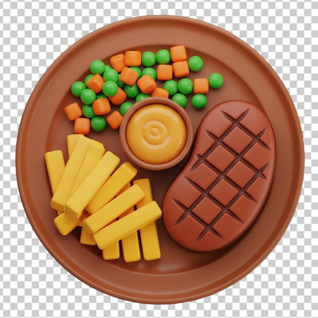Full 3D Dinner Plate with Steak Fries and Vegetables PNG Transparent Background
