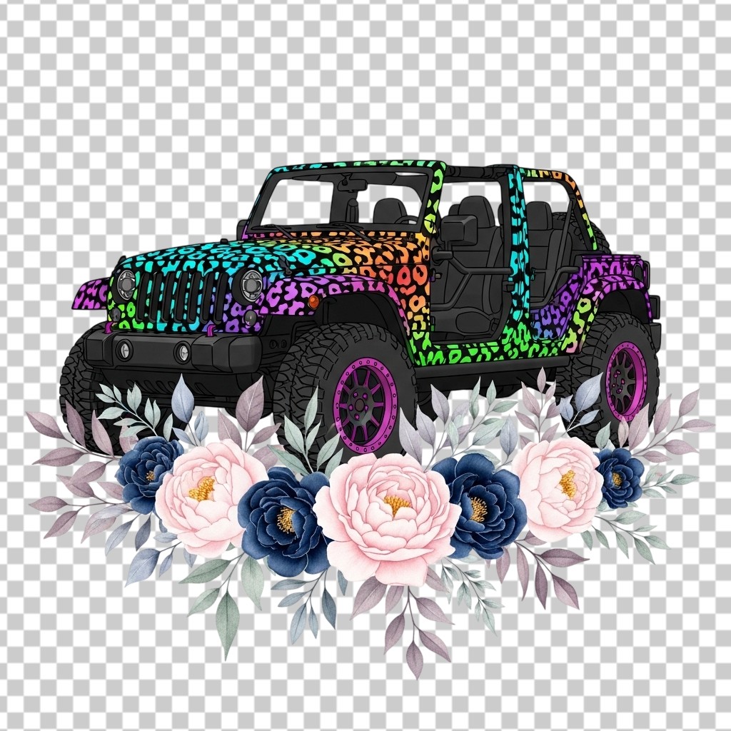 Stylish Jeep Vehicle Decorated with Colorful Flowers Illustration PNG Transparent Background