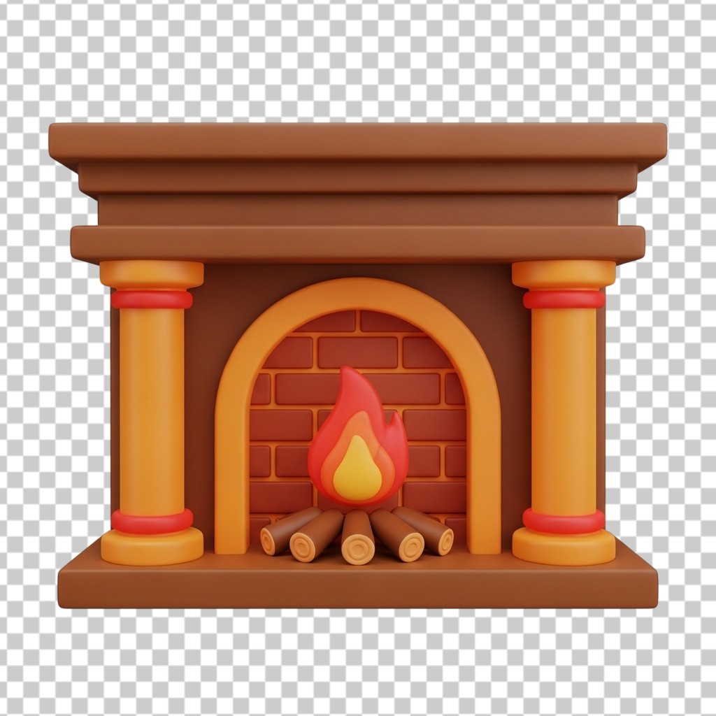 3D Isometric Cozy Brick Fireplace with Burning Wood PNG Transparent Background