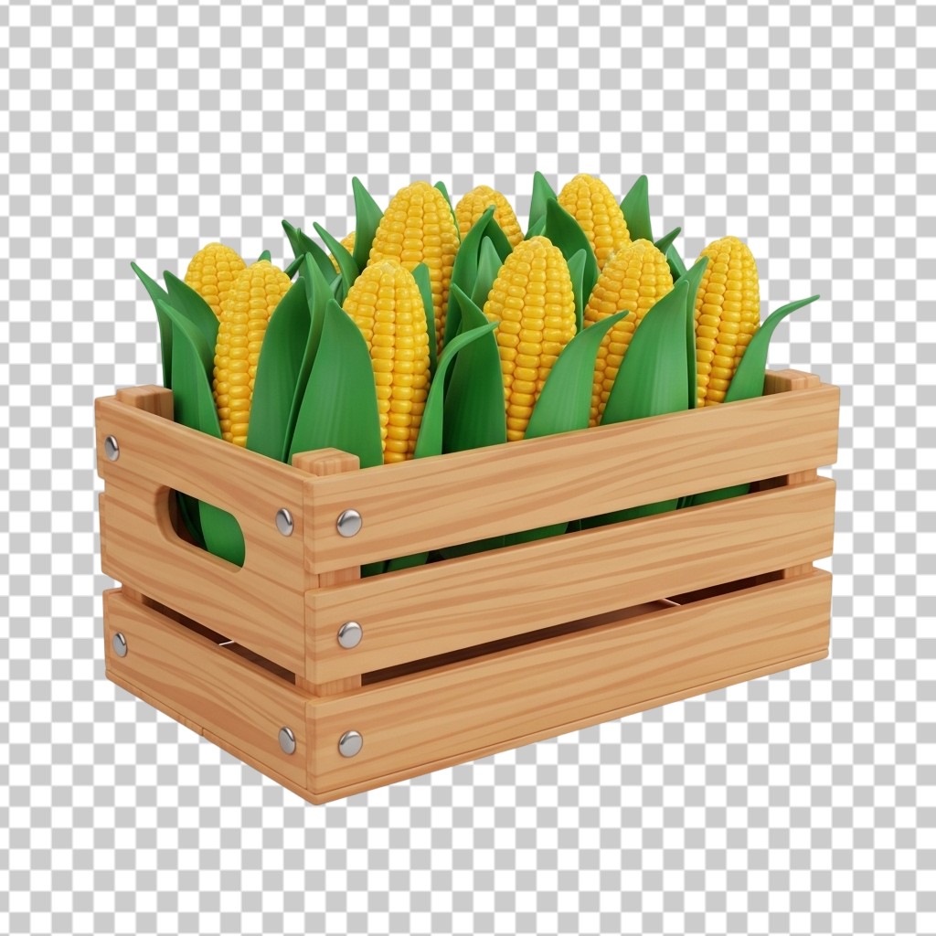 3D Wooden Crate Overflowing with Fresh Sweet Corn PNG Transparent Background