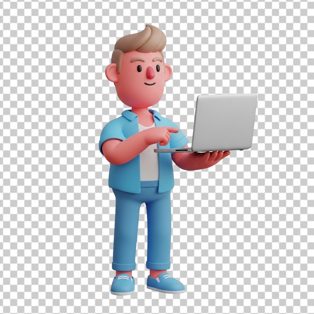 3D Young Professional Man Character Working on Laptop Computer PNG Transparent Background