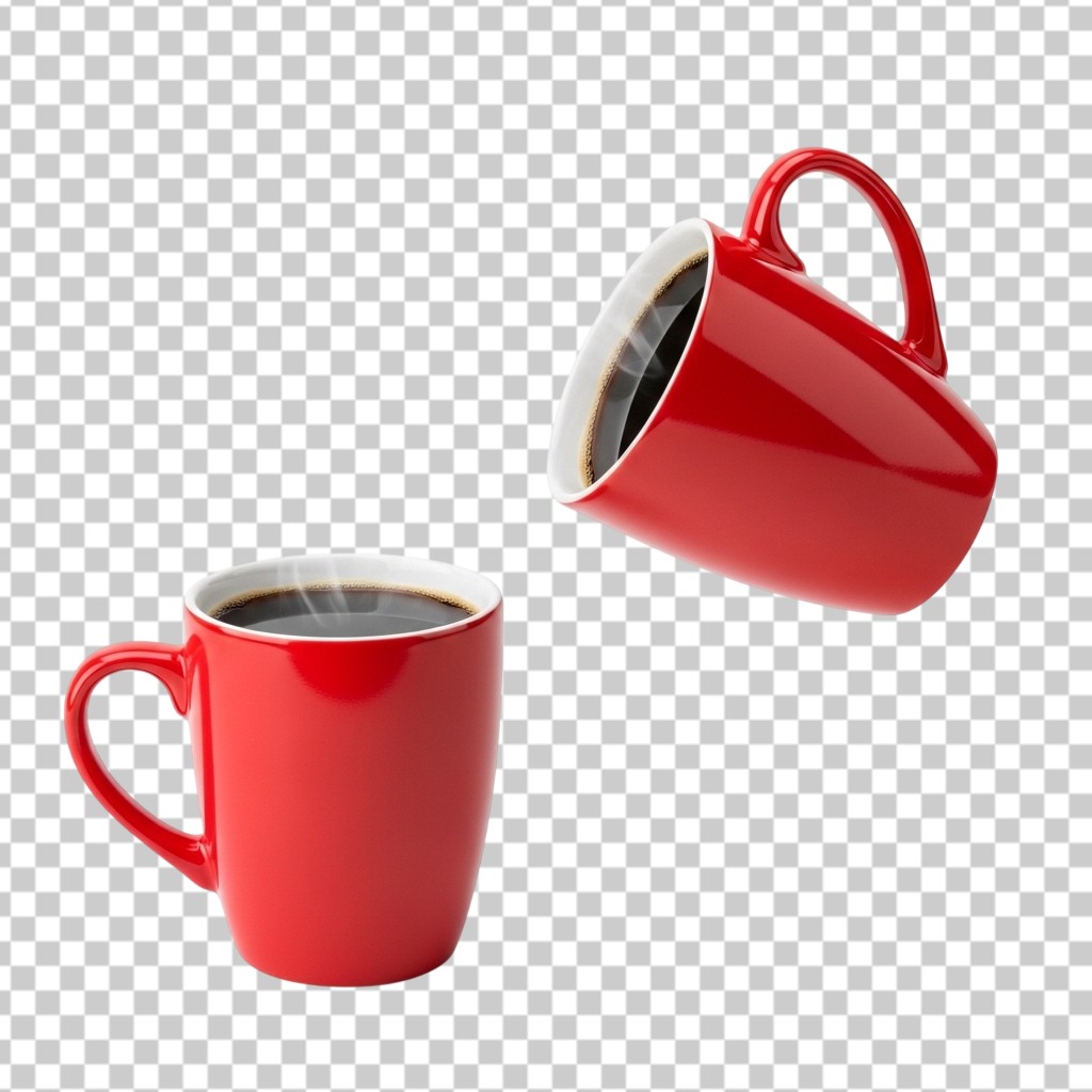 Red Ceramic Coffee Mug with Pouring Hot Coffee PNG Transparent Background
