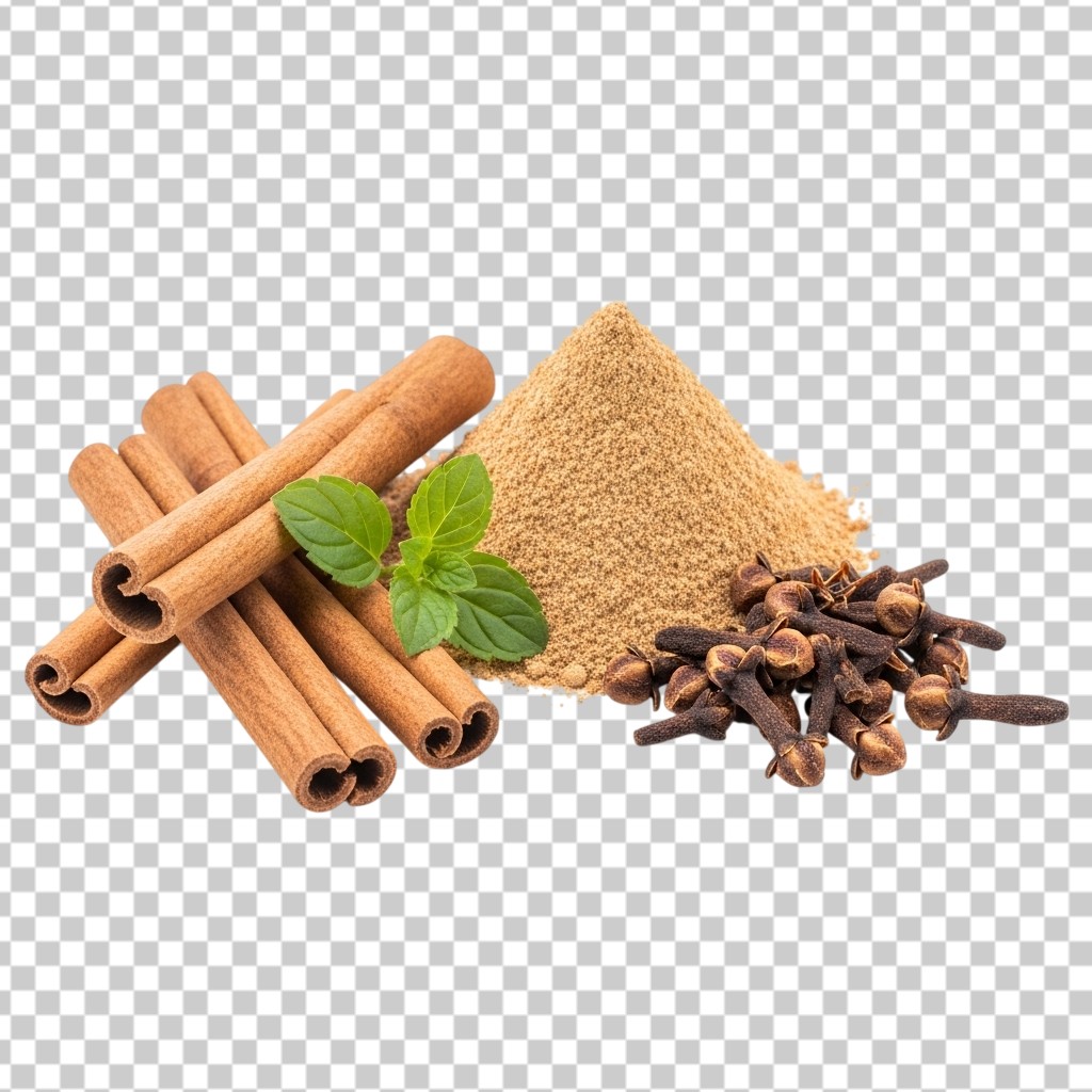 Cinnamon Sticks and Ground Powder with Cloves and Mint PNG Transparent Background