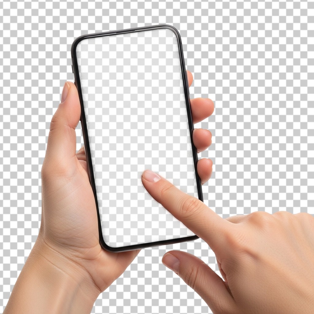 Hand Holding Mobile Phone with Blank White Touch Screen PNG Transparent Background