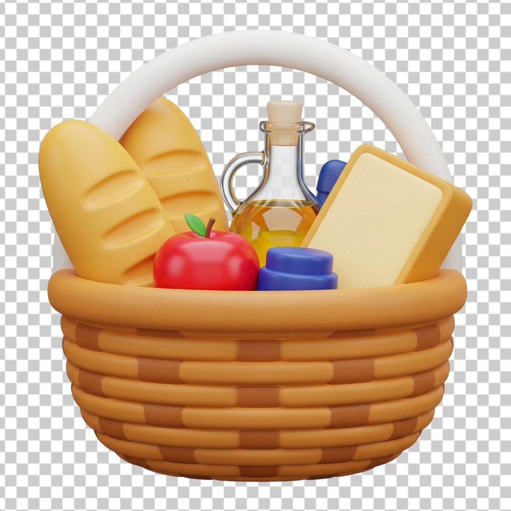3D Wicker Basket with Bread Apple and Oil Bottle PNG Transparent Background