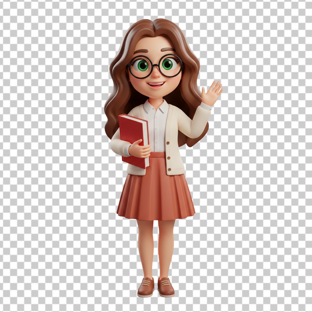 3D Smart School Girl Character Waving and Holding a Book PNG Transparent Background,3D