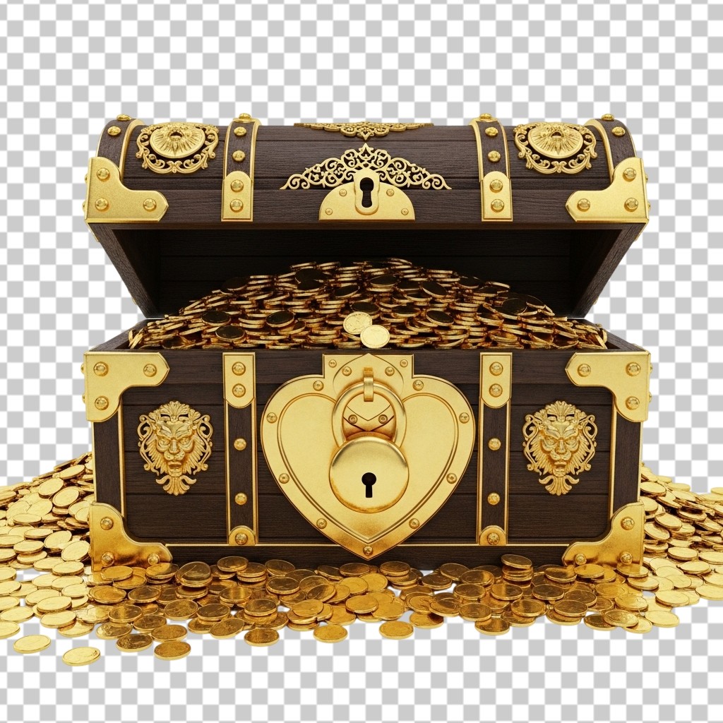 Intricate Gold and Black Treasure Chest Overfilling with Gold Coins PNG Transparent Background