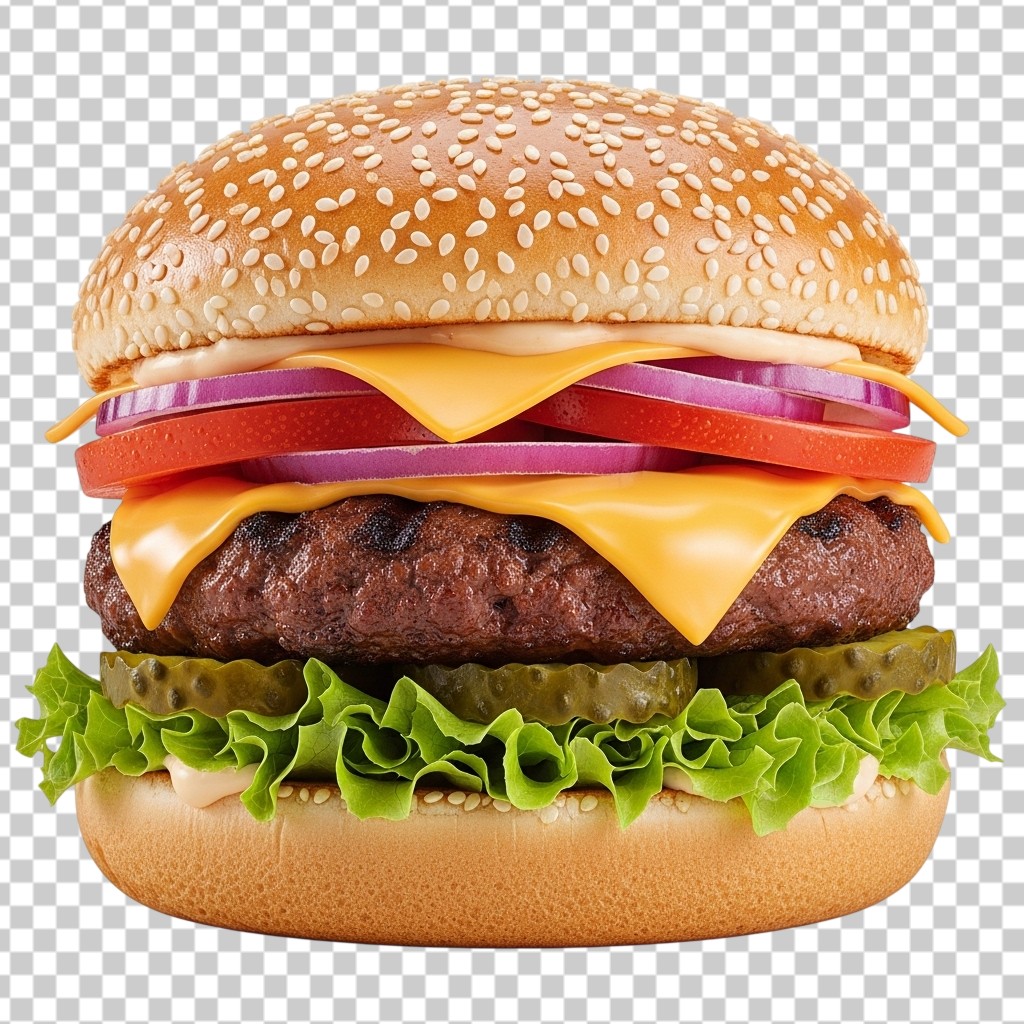 Juicy Double Cheeseburger with Fresh Lettuce Tomato Red Onion and Pickles PNG Transparent Background