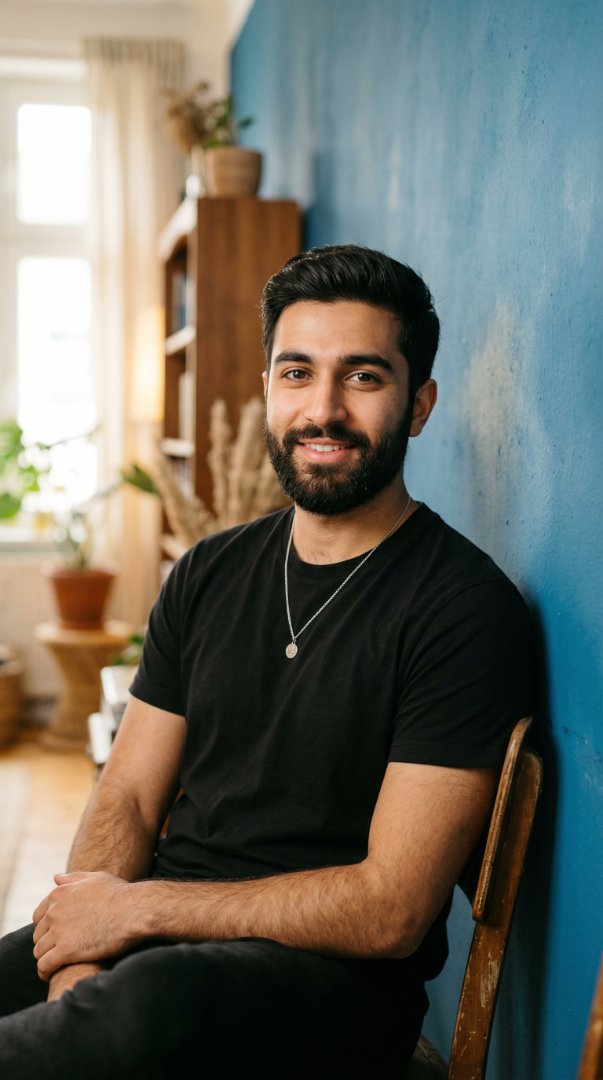 A warm indoor photograph of a handsome young man sitting casually in a brightly lit room.