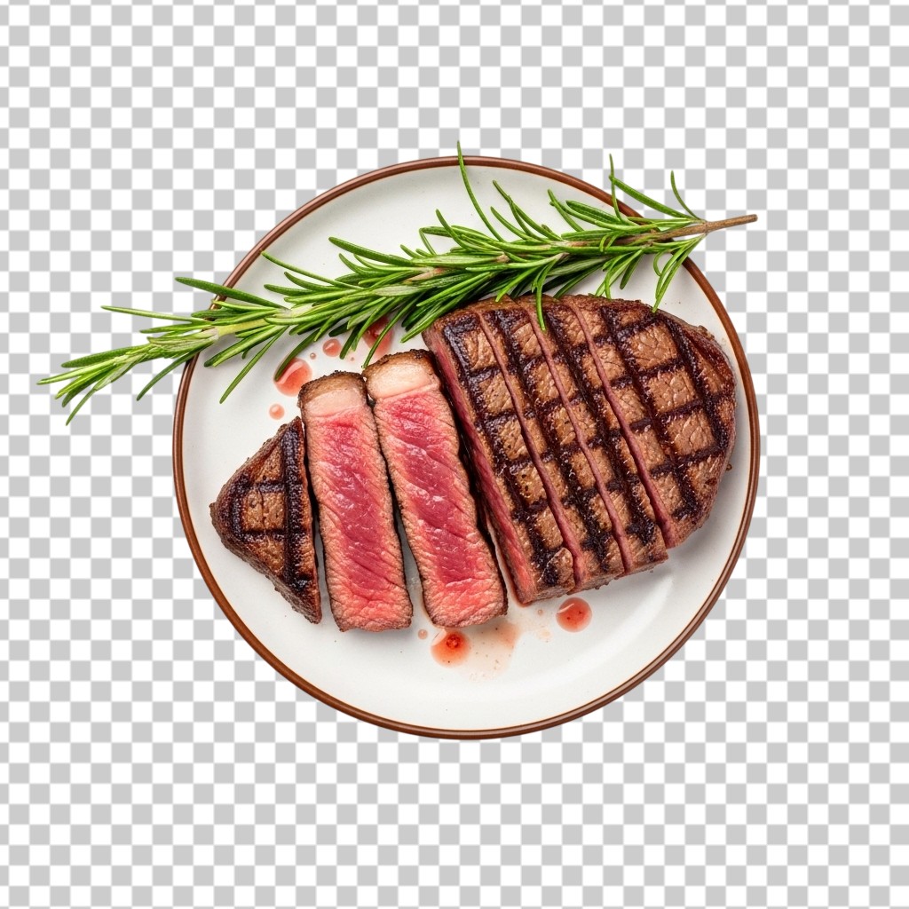Grilled Steak Slices Served on a White Plate with Garnish PNG Transparent Background
