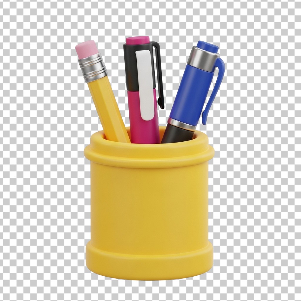 3D Yellow Pen Holder with Pencils and Markers PNG Transparent Background