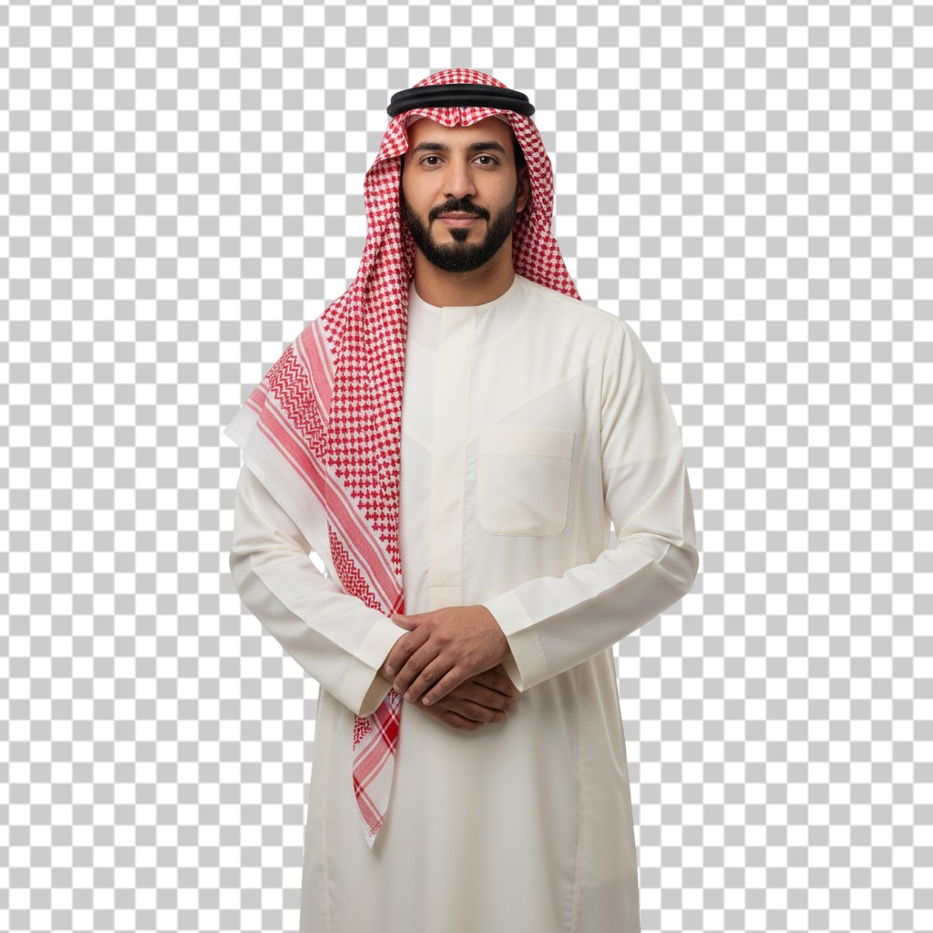 Traditional Middle Eastern Man in Red Ghutra and White Thobe Standing Calmly PNG Transparent Background