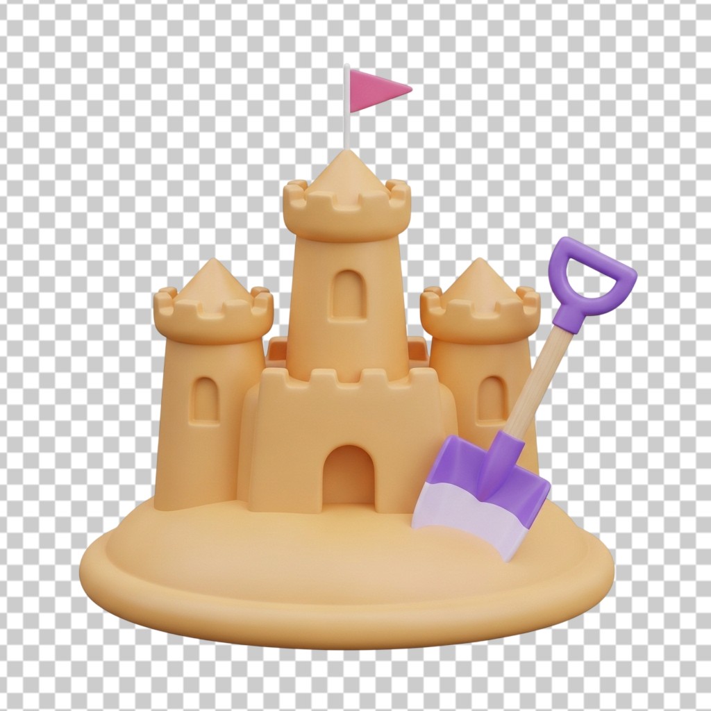 3D Sandcastle with Purple Shovel on Beach PNG Transparent Background