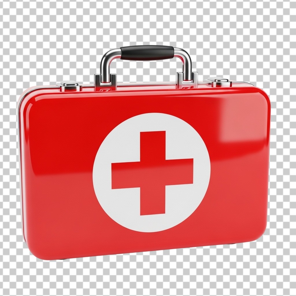3D Red First Aid Medical Emergency Kit Box with White Cross PNG Transparent Background