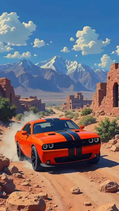 an orange sports car driving down a dirt road in the desert with mountains and clouds