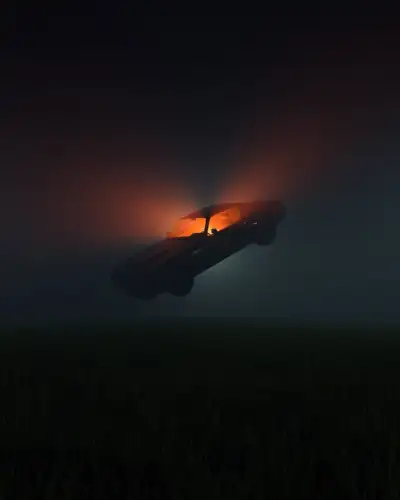 two cars parked in front of a gas station at night with the moon shining on the horizon