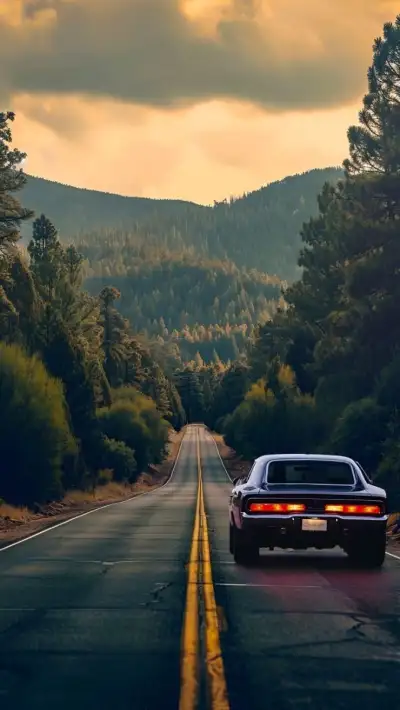 a red car driving down a road with fireworks in the sky above it and trees on either side