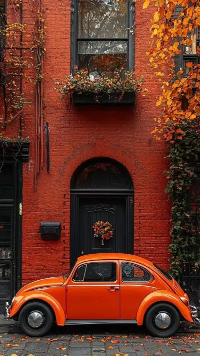 an orange car parked in front of a red brick building with autumn leaves on the ground