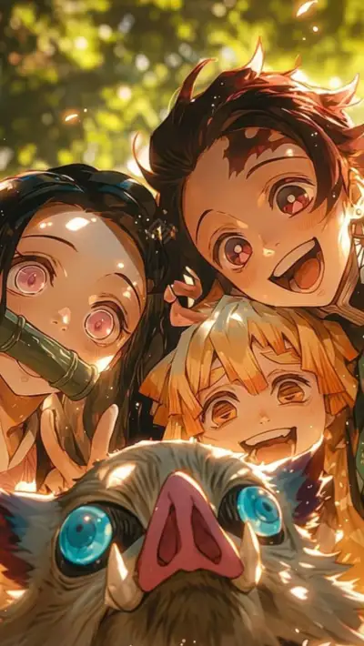 an animated image of some people and a cat with big blue eyes in front of trees
