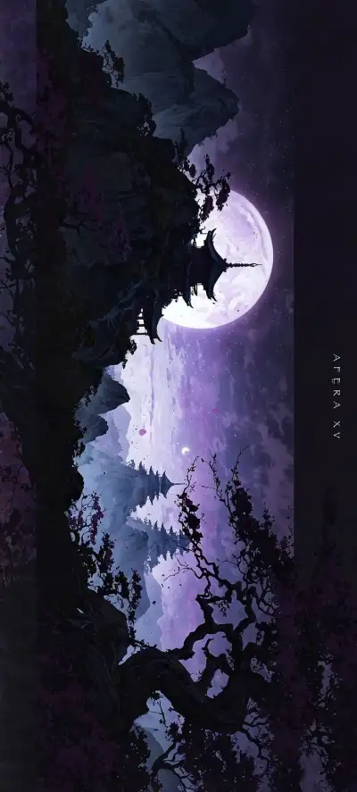a person standing under a full moon in the sky with pink flowers on it's trees