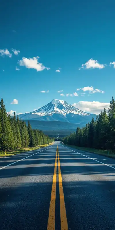 the road is lined with pine trees and mountains in the distance, as well as snow - capped peaks
