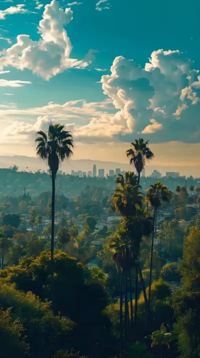 palm trees in the foreground with a city skyline in the background