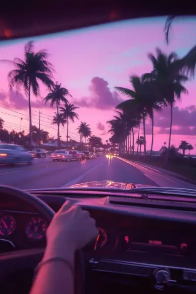 a car is parked on the side of the road with palm trees in the background