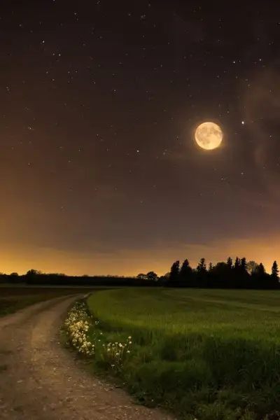 a night scene with the moon and stars in the sky over a dirt road leading to a grassy field