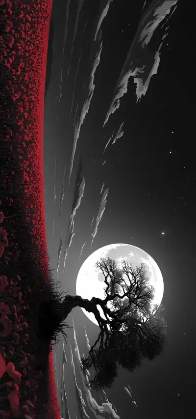 a woman with her hands on her face in front of a blue sky and red moon