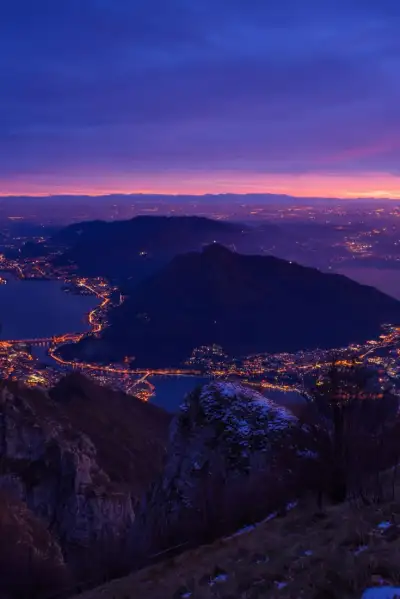 an image of a city at night with the moon in the sky and buildings lit up