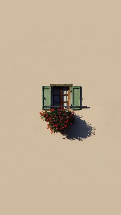 an open window with green shutters and red flowers in the planter below it
