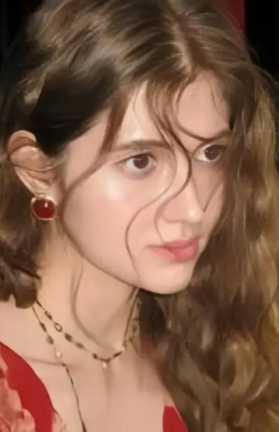a young woman with long brown hair wearing a red dress and posing for the camera