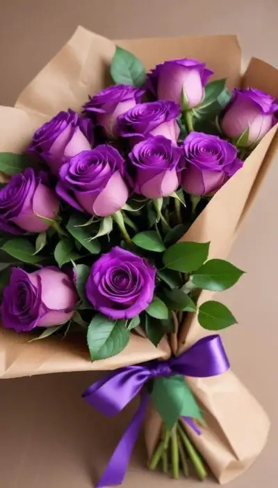 a bouquet of purple roses wrapped in brown paper